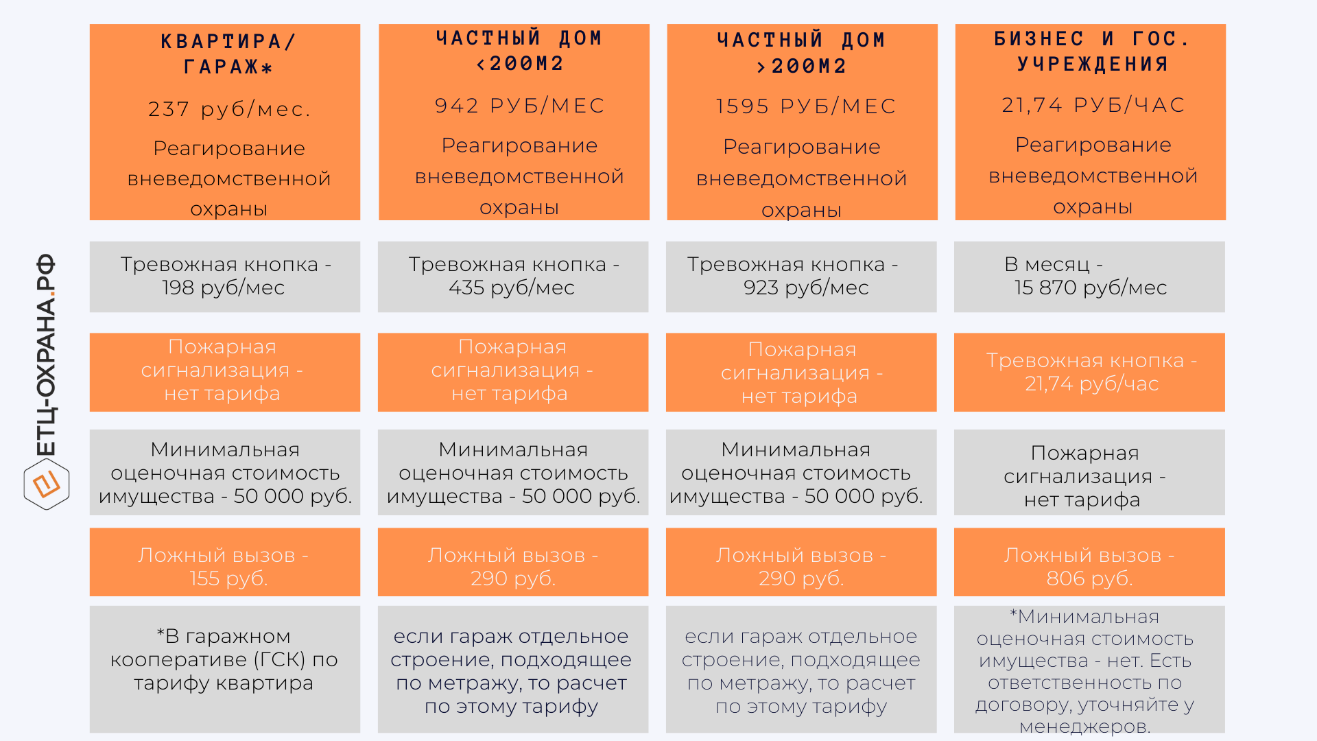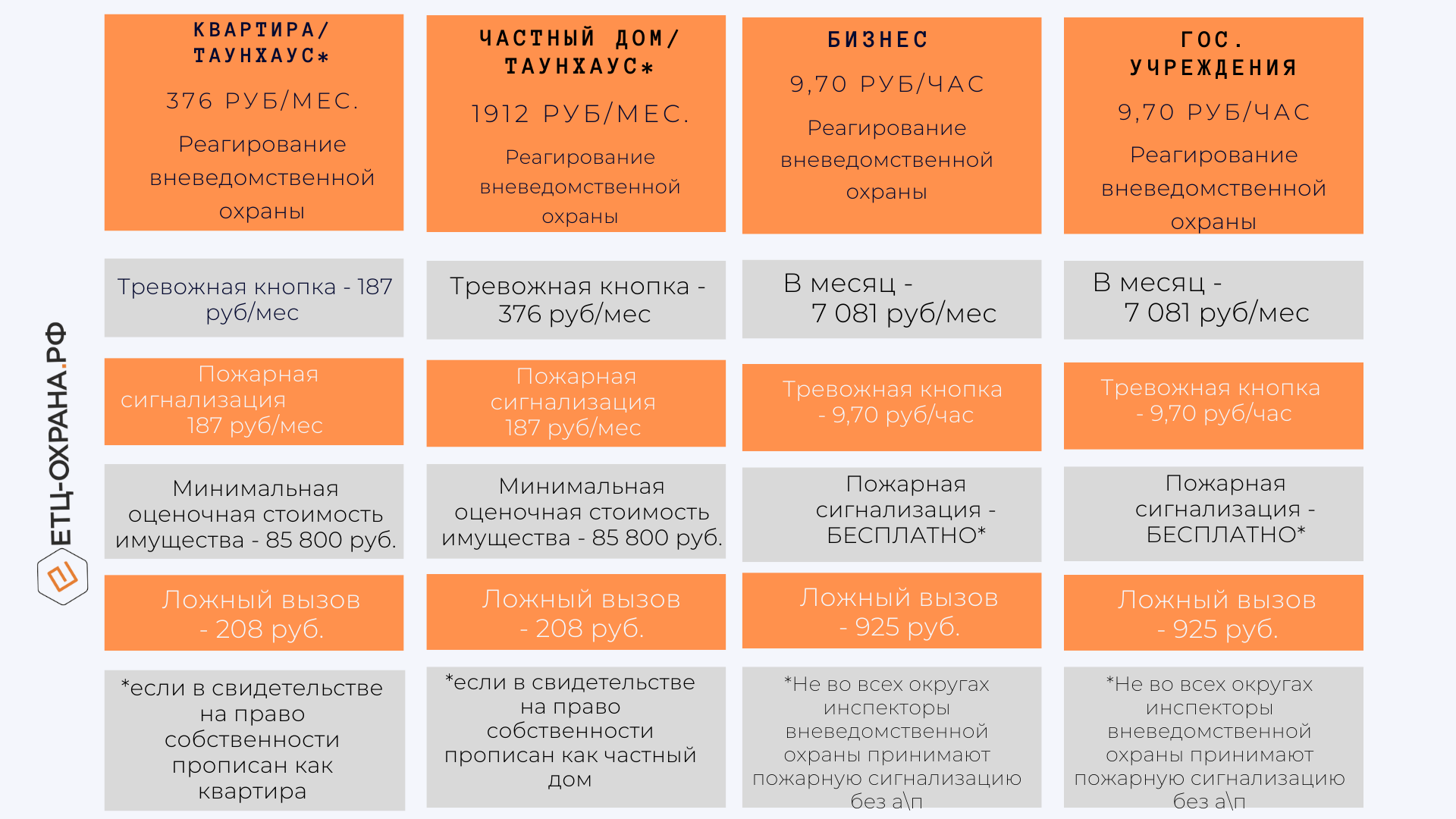 У нас подготовлена инфографика с тарифами на услуги УВО ВНГ России для квартир, частных домов, бизнеса, госучреждений.Тарифы на услуги вневедомственной охраны по Москве в 2024 году