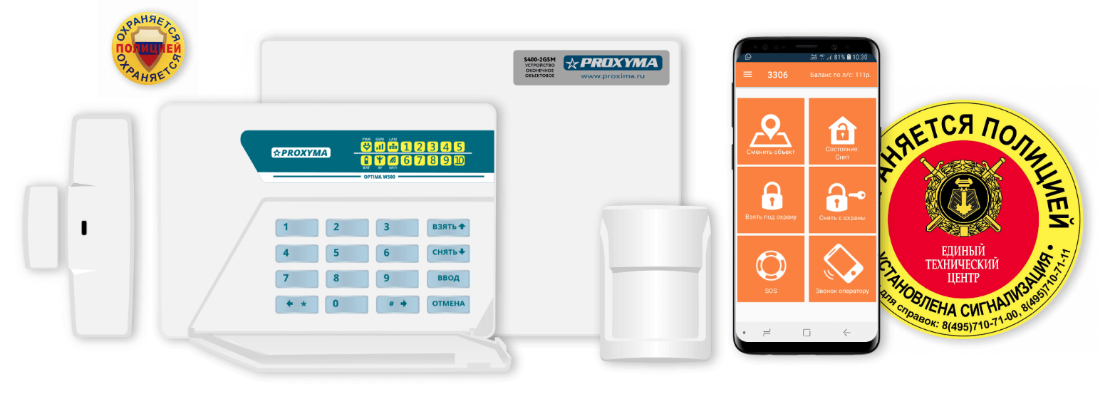Блок> Датчик открывания дверей Приемно-контрольный прибор Датчик на движение Наклейка охраняется полицией Мобильное приложение Световой индикатор